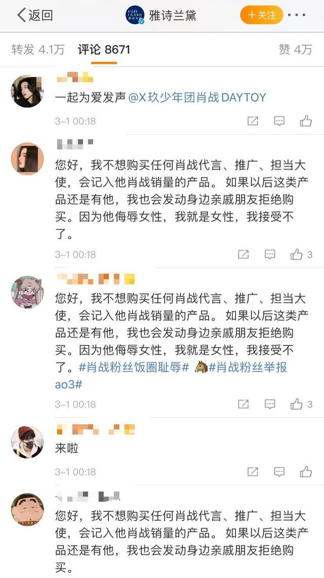 不少网友跑到肖战代言品牌的微博评论区进行评论,抵制购买肖战代言的该产品。