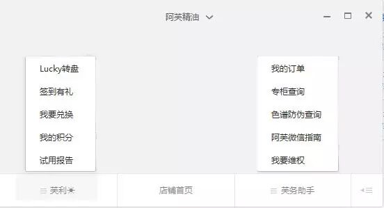 再看看阿芙精油的微信菜单栏设计。条理相比之下就清楚多了,以消费为导向:第一栏粉丝福利;第二栏购物;第三栏购物支撑。
