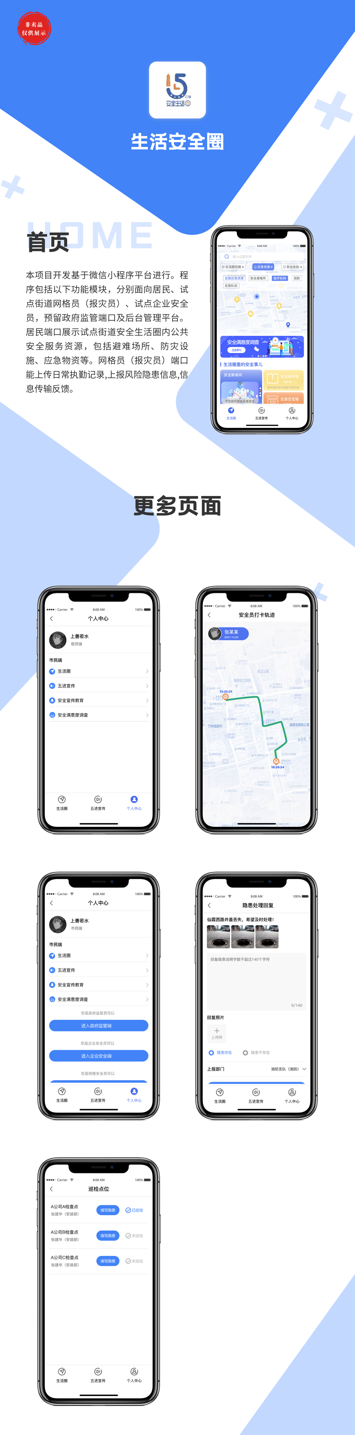 本项目开发基于微信小程序平台进行。程序包括以下功能模块,分别面向居民、试点街道网格员(报灾员)、试点企业安全员,预留政府监管端口及后台管理平台。居民端口展示试点街道安全生活圈内公共安全服务资源,包括避难场所、防灾设施、应急物资等。网格员(报灾员)端口能上传日常执勤记录,上报风险隐患信息,信息传输反馈。