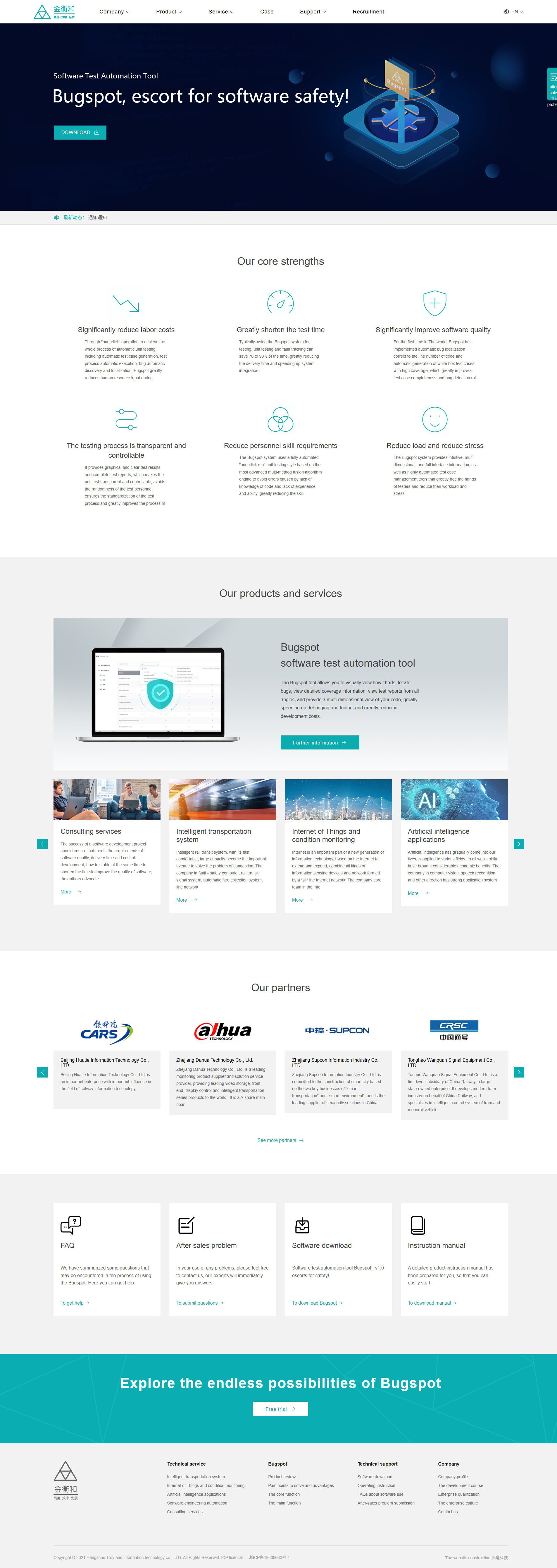 该案例是一个软件公司官网建设项目,语言是英文,客户的核心产品为自动化测试工具 Bugspot,杭州派迪科技围绕软件产品展示逻辑,帮助企业定制SaaS产品型官网,多年来对软件公司网站建设、SaaS官网设计、自动化测试工具网站开发、科技企业官网制作、软件产品展示型网站开发经验丰富。